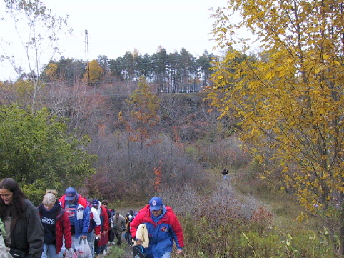 The parking field is called The Original Short Cut Lot. There’s a well-worn path down into a ravine and under power lines to the far parking lots aroung Ralph Wilson Stadium. Wrong shoes.